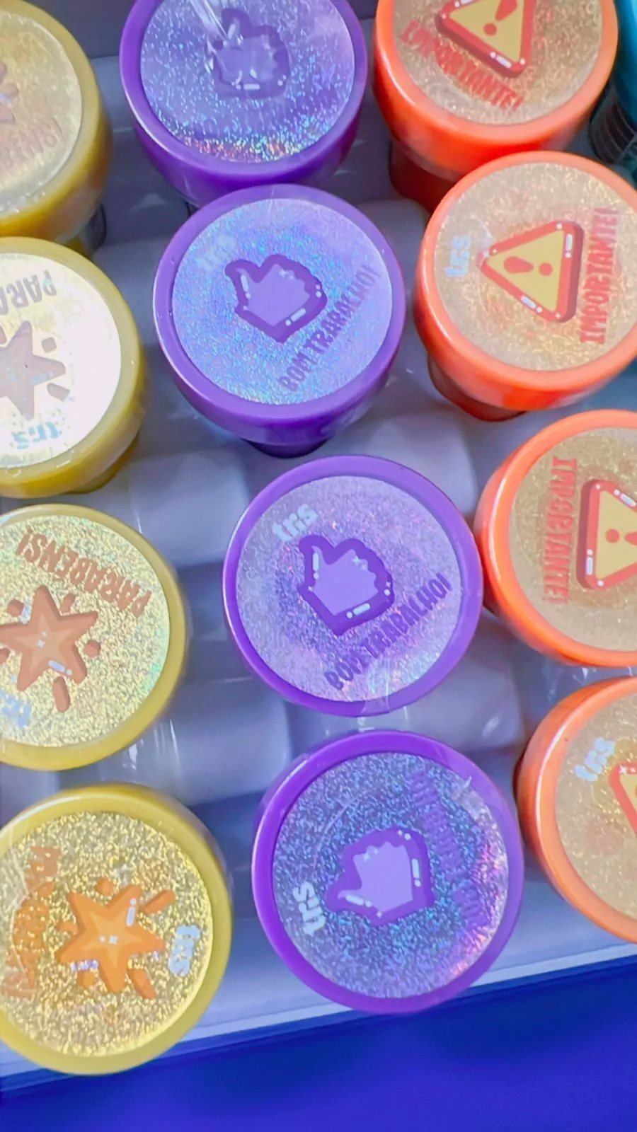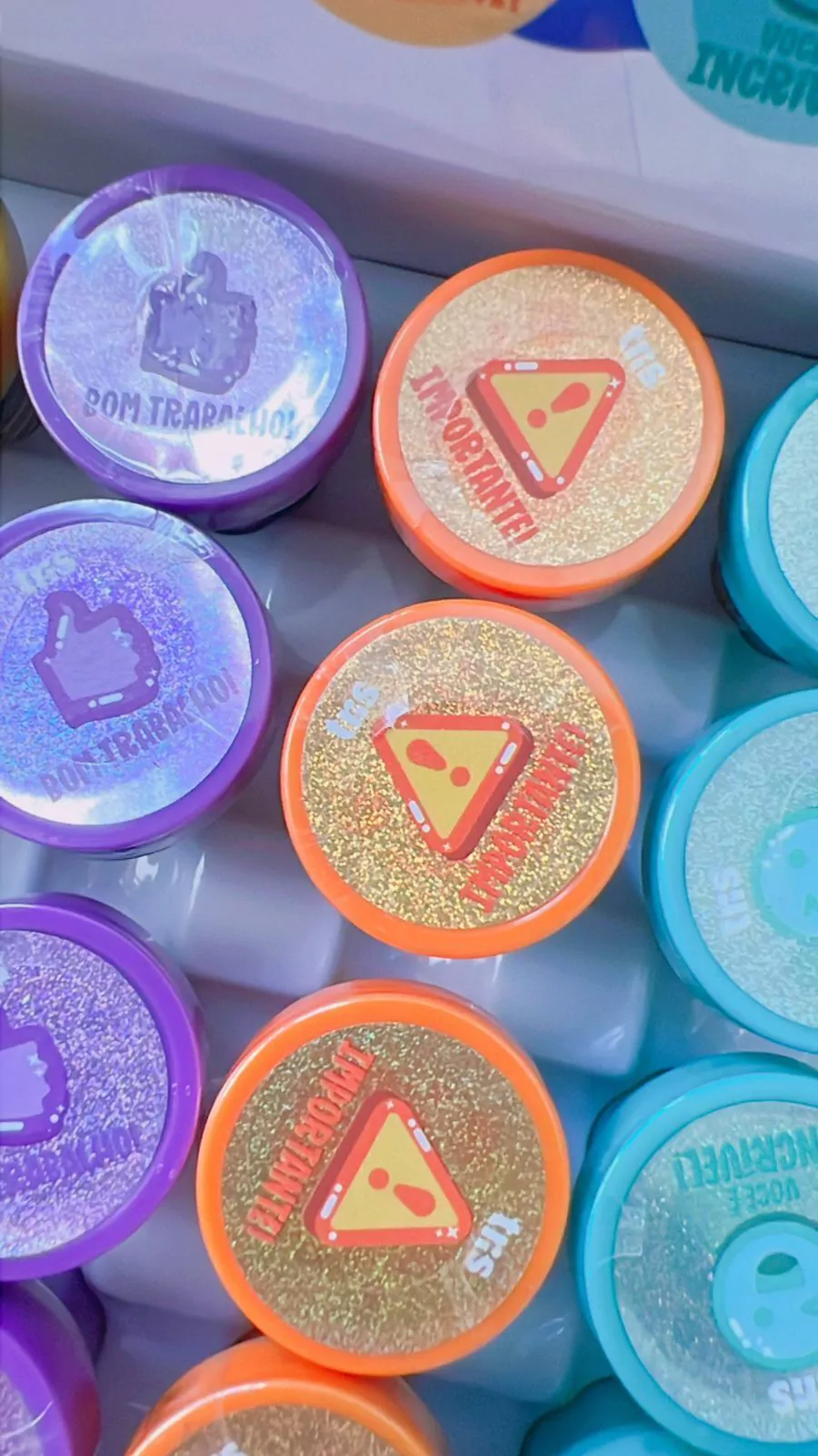 Carimbos coloridos pra você colecionar e que vão deixar seu caderno mais lindo! Já vem com tinta prontinho para usar.